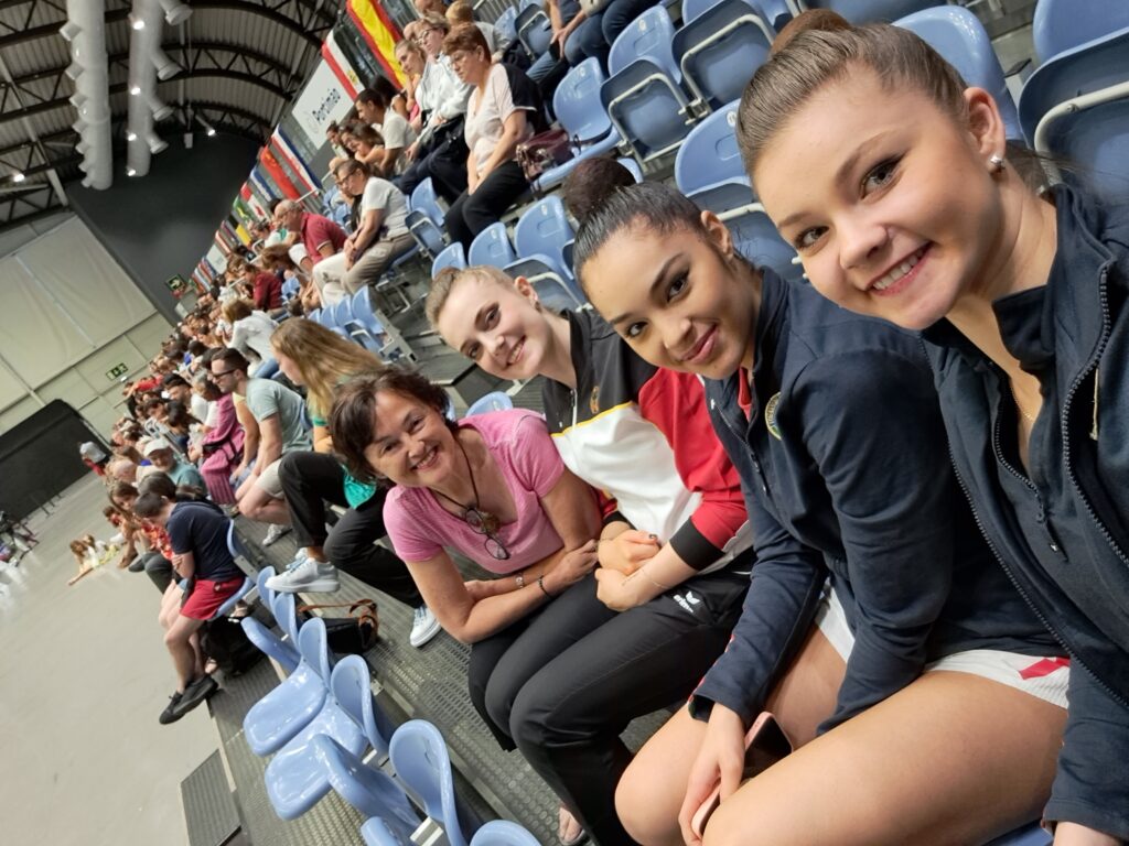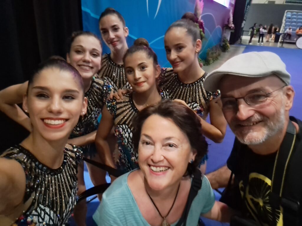 Cuando acabó la ceremonia se desbordó la alegría, todo eran abrazos, lágrimas, risas, selfies … Una piña todo el equipo. Elisa y yo esperando la oportunidad de felicitarlas y lograr una foto con ellas. Parecía llegado el momento, les pedimos una foto, estaba algo ya disgregado el grupo, se volvieron a llamar a las compañeras y, en ese momento, una mujer nos interpeló. ¿Sabéis que os habéis hecho famosos? Nos volvimos hacia ella y le preguntamos si era madre de alguna gimnasta del equipo y nos dijo que no. Que en su juventud fue gimnasta, luego entrenadora y ahora le tocaba el papel de mala, de juez.