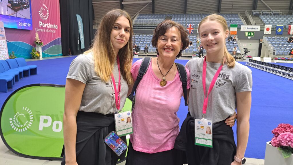A modo de introducción nos dijeron que habían estado observando nuestra presencia desde el primer día de competición y que les había llamado mucho la atención que habíamos asistido a todos los ejercicios y aplaudido a todas las gimnastas y que parecía que sentíamos la necesidad de interactuar con ellas. Nos volvimos a mirar sorprendidos y les dijimos que, en efecto, así era. Mafalda quería saber si teníamos alguna gimnasta actuando con la que tuviéramos lazo de parentesco y les dijimos que no. Nos preguntó, a continuación, si acaso habíamos practicado la gimnasia rítmica y Elisa les respondió que ella desde los siete a los diecisiete años había practicado la gimnasia deportiva pero que desde hace más de quince años se ha pasado a la rítmica. Desde entonces no nos perdemos una competición que vemos en televisión, generalmente a través de grabaciones en YouTube. También nos dijeron que tenían noticia de que no era nuestro primer campeonato de Portimao. Les confirmamos que efectivamente así era. Este era nuestro tercero y que desde 2019 vamos a ver en vivo todas aquellas competiciones que nos quedan relativamente cerca, desde Portimao a Marbella y desde Guadalajara a Pamplona o el Euskalgym. Y entonces nos dijeron que éramos unos espectadores un tanto especiales y que por eso nos habían elegido para la entrevista. Un poco raros si que somos, les respondimos.
